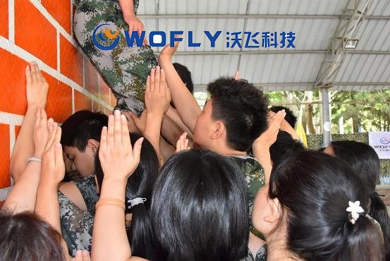 團(tuán)建的壓軸項目是翻越一面4.3米高的“畢業(yè)墻”,無任何輔助道具,無任何外力幫助,只憑借單槍匹馬,是不可能爬上去的,想要過去的唯一途徑依靠于沃飛30人的團(tuán)隊力量。在這個過程中,沃飛團(tuán)隊就像一個大家庭,無論男生女生,都貢獻(xiàn)著自己的力量,搭建人梯、群力托舉,伙伴們有力的肩膀,一雙雙托舉的手,一張張憋足了勁而漲紅的臉,每個人都在借助身邊人的力量向上爬,也在拼盡全力幫助其他小伙伴登上墻頂。