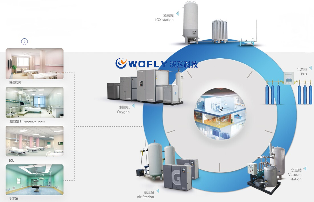 為了保證疫情期間醫用氧氣供應,沃飛科技暢通供氧“生命線”,為醫院提供從技術咨詢、整體規劃、集中供氣系統設計、選定設備、預制組件、項目現場安裝建設、整體系統檢測等全套工程技術服務和配套產品與一體的交鑰匙式服務,其集中供氧系統配置有二級調壓系統和氣體管道,可以按照醫院需求為病房或實驗室的用氣使用點輸出穩定的氣體,通過輸氧管路,便捷地將氧氣輸送至醫院病房、急救室、觀察室和手術室等科室,優于傳統鋼瓶供氧的方式,更好地解決醫療用氧的需求。例如,制氧系統輸送的氧氣能更好地配合呼吸機使用,滿足呼吸機的連續開機,高流量、連續不斷地供給氧氣的要求。