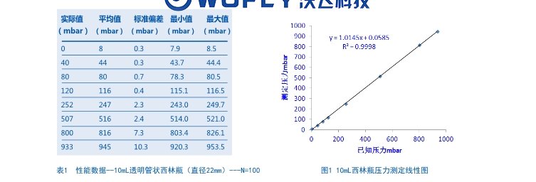 采用填充氮氣壓力為0、40、80、120、253、507、800和933 mbar的一組壓力標 準評估用于測定總頂空壓力的系統(tǒng)性能。通過直徑為22mm的10mL西林瓶建立這些標 準。使用FMS-1400頂空水汽/真空度測試儀測定每種標準100次。FMS-1400頂空水汽/真 空度測試儀測定容器頂空中水蒸氣分子的激光吸收量。吸收信號寬度與氮氣壓力相關(guān)。根 據(jù)測得數(shù)據(jù)確定平均濃度、標準偏差、最大讀數(shù)和最小讀數(shù),這些數(shù)據(jù)如表1所示。圖1所示 為表1中壓力數(shù)據(jù)的線性圖。