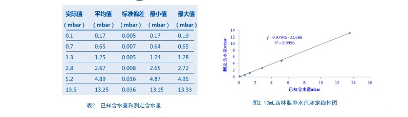 使用填充水蒸汽壓力為0.1、0.7、1.3、2.8、5.2、13.5mbar的一組水汽標準物質(zhì)評估用于測定水蒸氣壓力的系統(tǒng)性能。通過直徑為 22mm的10mL西林瓶建立這些標準。使用FMS-1400水汽/真空度測試儀測量每種標準物質(zhì)100次。FMS-1400水汽/真空度測試儀測量容器頂空中水蒸汽分子激光吸收量。吸收信號振幅與頂空水汽汽濃度成比例。根據(jù)測得的數(shù)據(jù)集確定平均濃度、標準偏差、最大讀數(shù)和最小讀數(shù),這些數(shù)據(jù)如表2所示。圖2所示為表2中水分濃度數(shù)據(jù)線性圖。這種測定的無損特性使得我們可以建立系統(tǒng)性能的全面統(tǒng)計文檔。從應(yīng)用的觀點來看,采用無損測量可以在同一個樣品上隨著時間進行多次測定(例如在整個貨架期內(nèi)進行多次測定),并且進行全面的批量分析可幫助客戶深入了解工藝的變化和對應(yīng)的優(yōu)化措施。