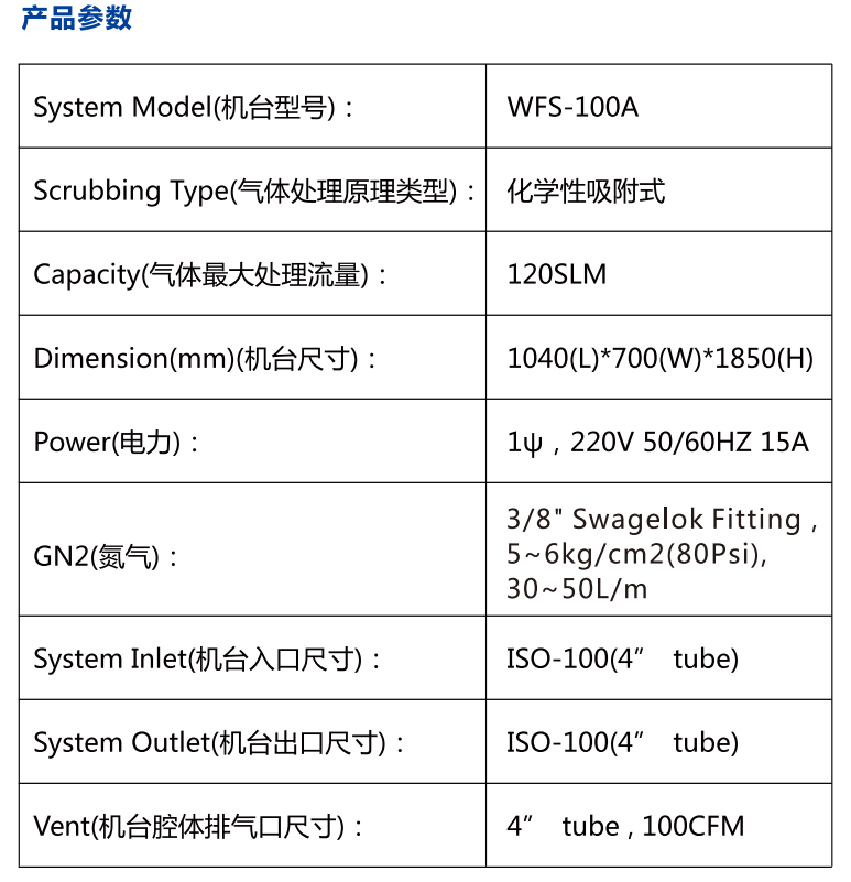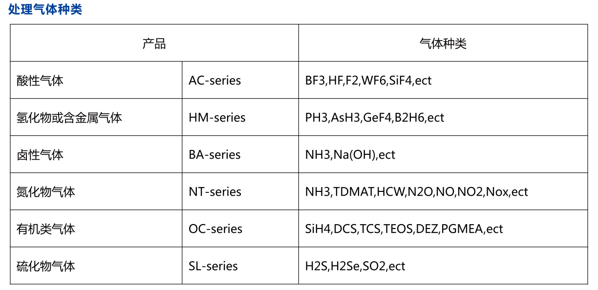 WFS-100F吸附式local scrubber 尾氣處理設備可處理氣體種類包括半導體、液晶以及太陽能等行業(yè)中蝕刻制程與化學氣相沉積制程中使用的特氣,主要包括SiH4、SiH2Cl2、PH3、B2H6、TEOS、H2、CO、NF3、SF6、C2F6、WF6、NH3、N2O等。